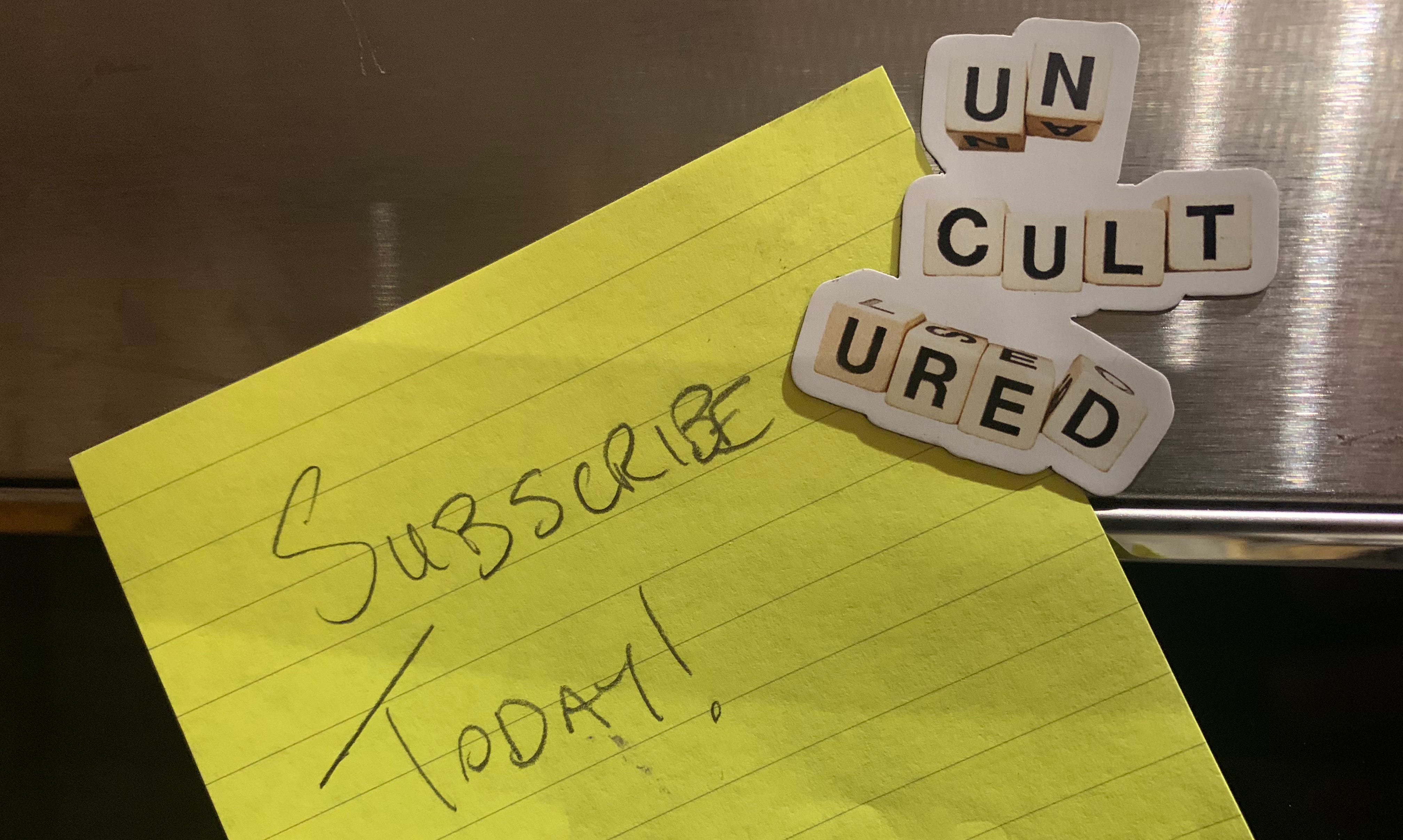 Help spread the word! Letting others know about Uncultured is the best way to support what we do. If you click THIS LINK in your inbox it will generate a pre-written message* that you can forward to anyone who might enjoy joining the Uncultured club. As a token of thanks, sign up for some free Uncultured swag (magnets and stuff!) by clicking here.