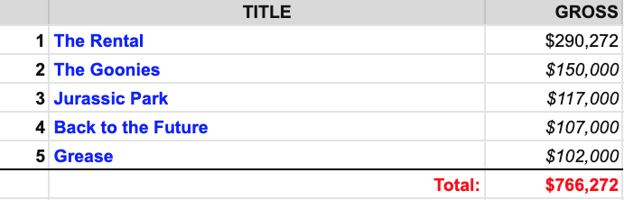 Consider the top five movies at the North American box office last weekend, per BoxOfficeMojo.com. (Creepy cabin horror The Rental is playing stateside only.)