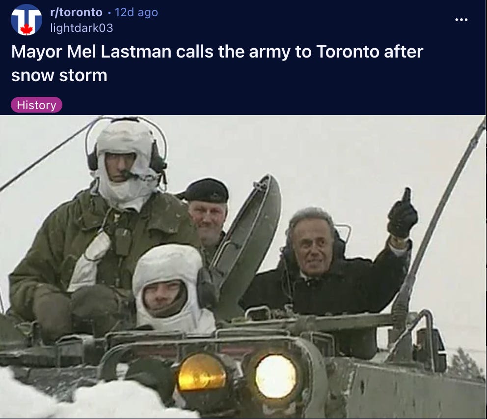 That’s when Toronto mayor Mel Lastman infamously waved the white flag and called in the army to clean up our own snowstorm in 1999.