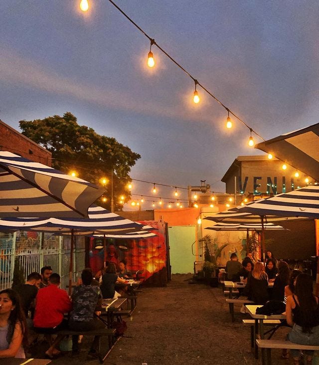 Nearby on Dundas is the Venice Beach Bar, part of a micro-trend of parking lots made festive with picnic tables and string lights. This one’s a partnership between Bar Mordecai and Unboxed Market. Squint and you can almost believe you’re in Santa Monica (facing away from the beach).