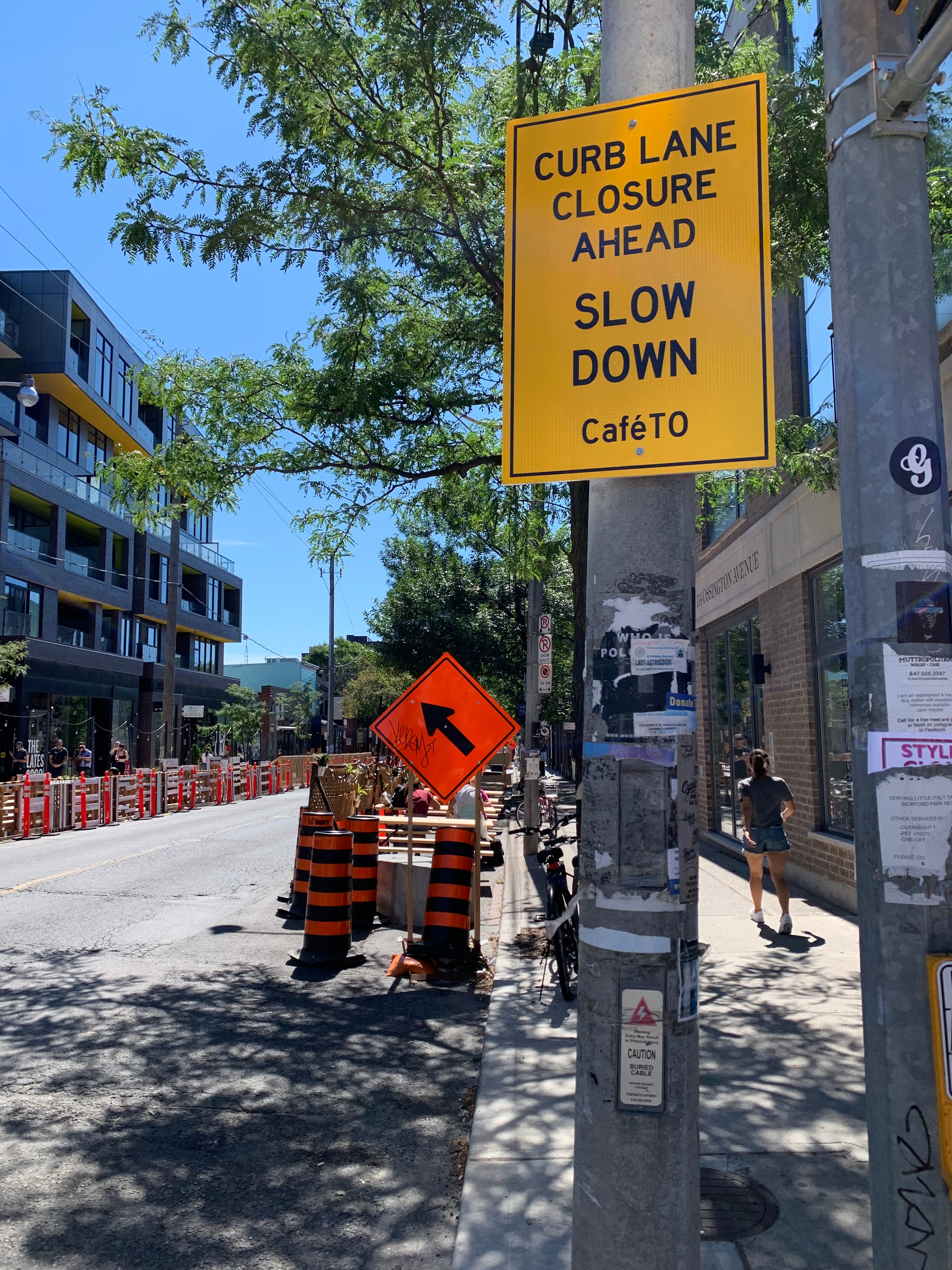 The whole city’s main retail drags have essentially become pop-up versions of the King Street Pilot Project, with traffic reduced to a single lane in each direction (favouring pedestrians rather than streetcars in this case).